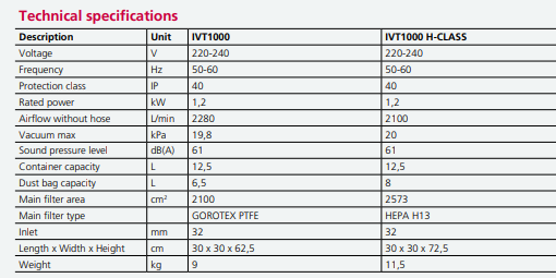 - Model IVT1000 is a small vacuum unit, ideal for clean room environments, where maximum sterilization and full contamination control are standard requirements. It is small, quiet, and can be completely sterilized, the right solution for recovering small quantities of toxic (or even potentially lethal) powder. Modularity Thanks to its modular construction, the IVT1000 can be easily disassembled and thoroughly inspected/cleaned. The practical and safe locking clamps ensure air-tight sealing and quick and easy servicing operations. Safety first Thanks to the new filter-ring, changing the main filter today is safer: the filter never touches the ground and no powder comes into contact with any surface. Maximum sterilization All accessories are made of stainless steel or high-resistance silicon. This means that hoses, hand-tools and nozzles can all be fully sterilized in autoclave at 130°C. H-class version Model IVT1000 can also be provided in class H, thanks to its stainless steel 316 construction, its powder disposal mechanism with safe-bag, and the possibility of fitting an upstream HEPA filter (class H13). In this version the IVT1000 is suitable for use inside the strictest of cleanrooms.
