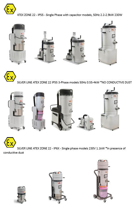 These vacuums are used for materials that can create explosive dust clouds or fire hazards.