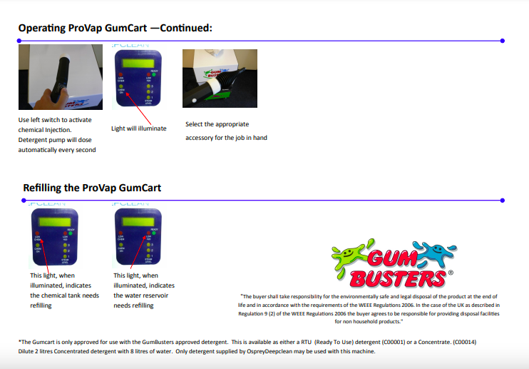 The GumCart makes great use of dry steam. When combined with our own detergent the GumCart dissolves gum on contact and, with a little agitation with a brush by the operator; the gum is busted in approx. 3 seconds flat!!